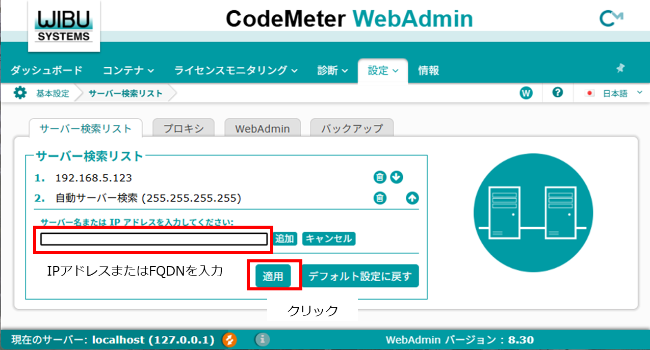 接続先のライセンスサーバのIPアドレス(またはFQDN)を入力し、「適用」をクリックします。