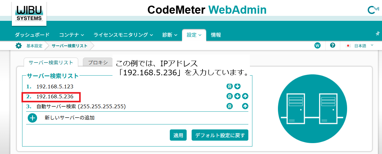 テキストボックスに、接続先のライセンスサーバのIPアドレス(またはFQDN)を入力し、「適用」をクリックします。
