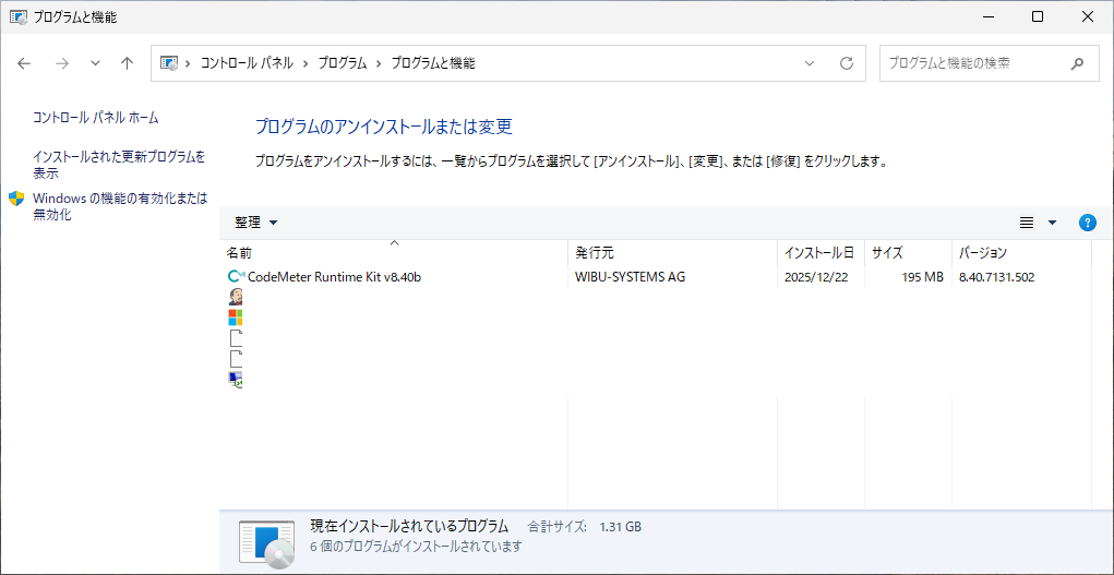 コントロールパネルから、「プログラムと機能」を開き、「CodeMeter Runtime Kit」をアンインストールします。