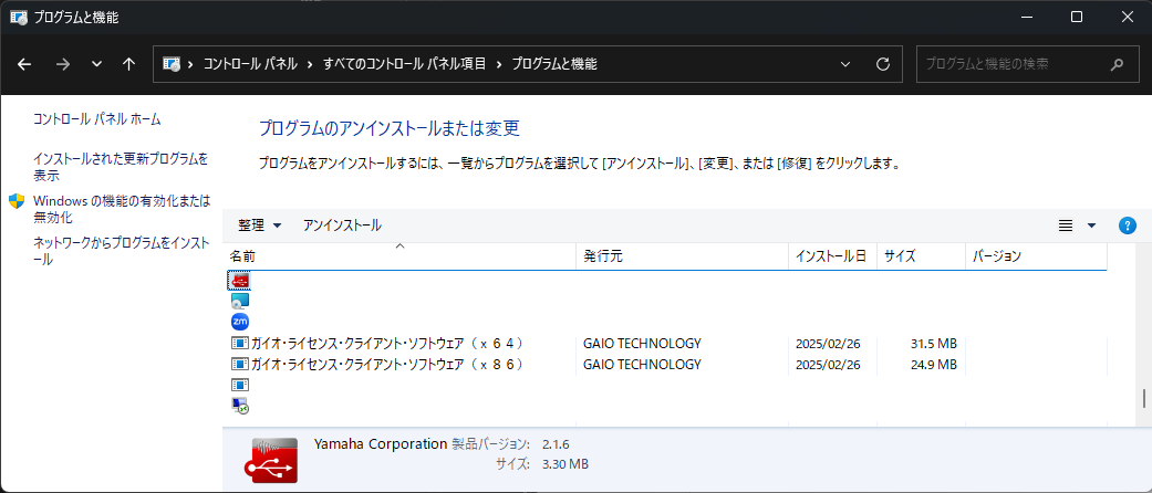 コントロールパネルから、「プログラムと機能」を開き、「ガイオ・ライセンス・クライアント・ソフトウェア」をアンインストールします。